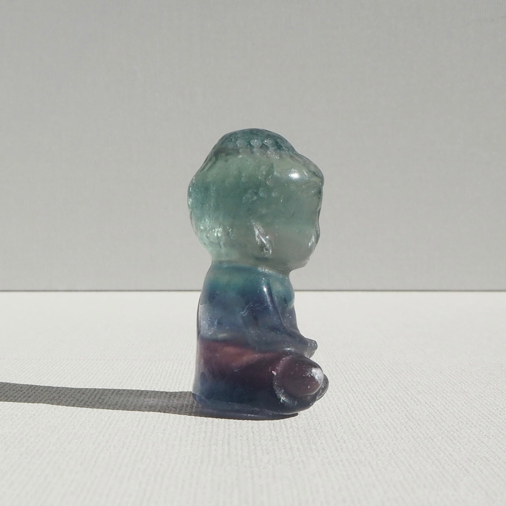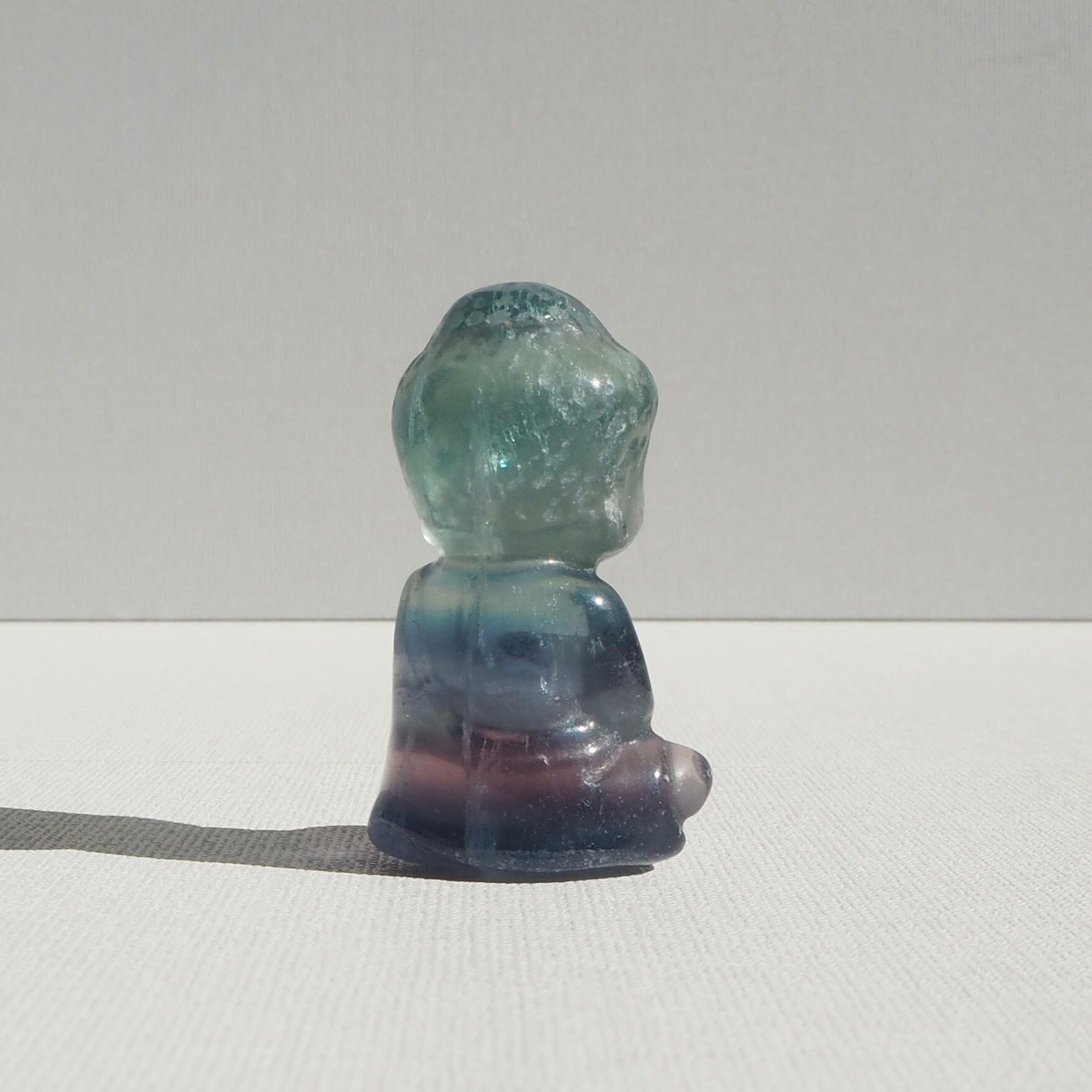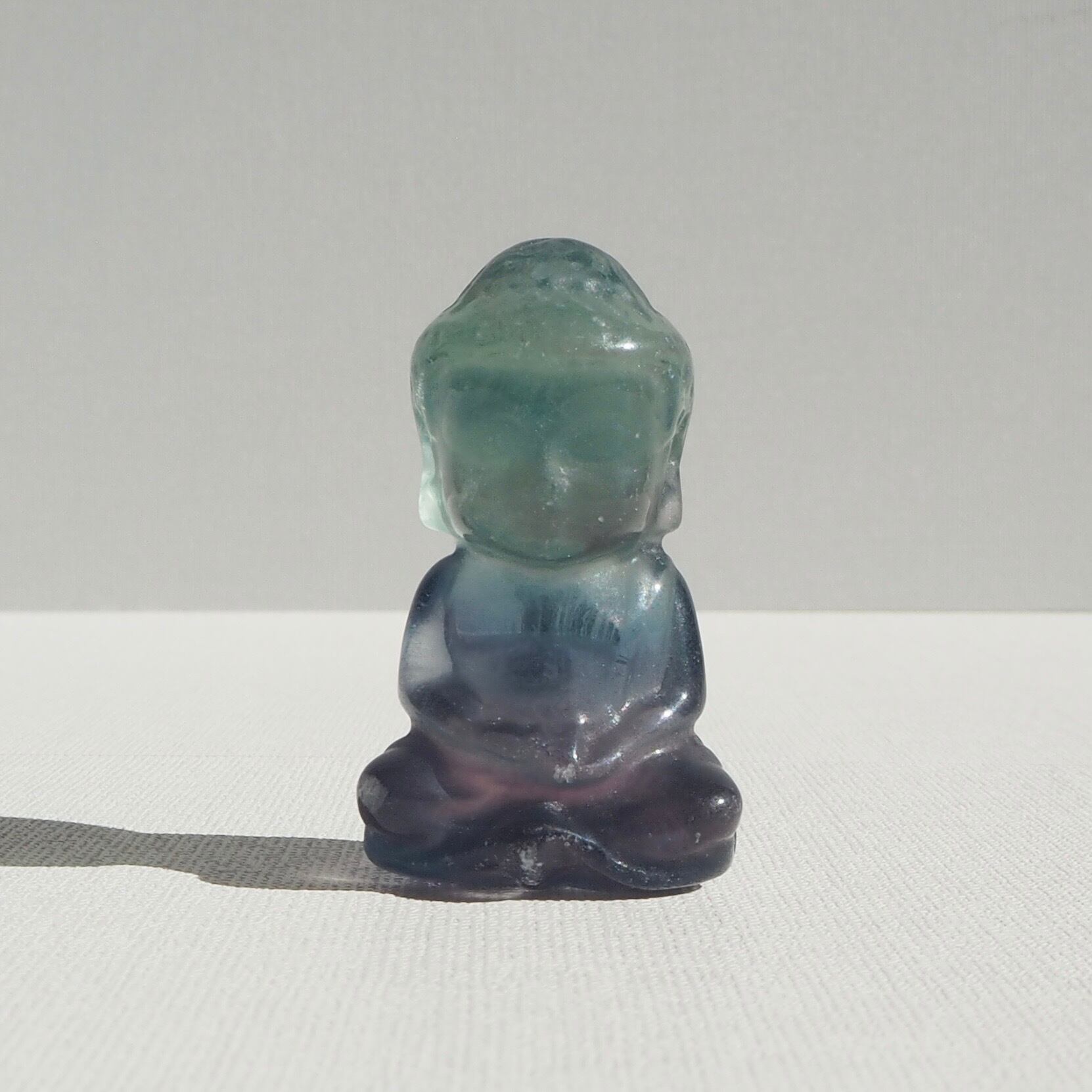 2つの色が美しく溶け合うフローライトを、穏やかな表情のブッダ(仏陀)像に彫り上げました。