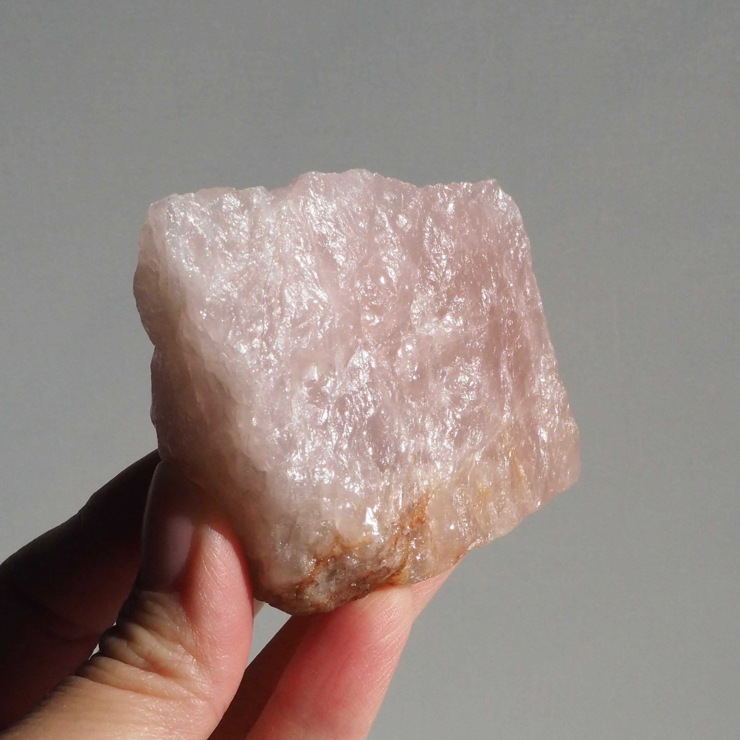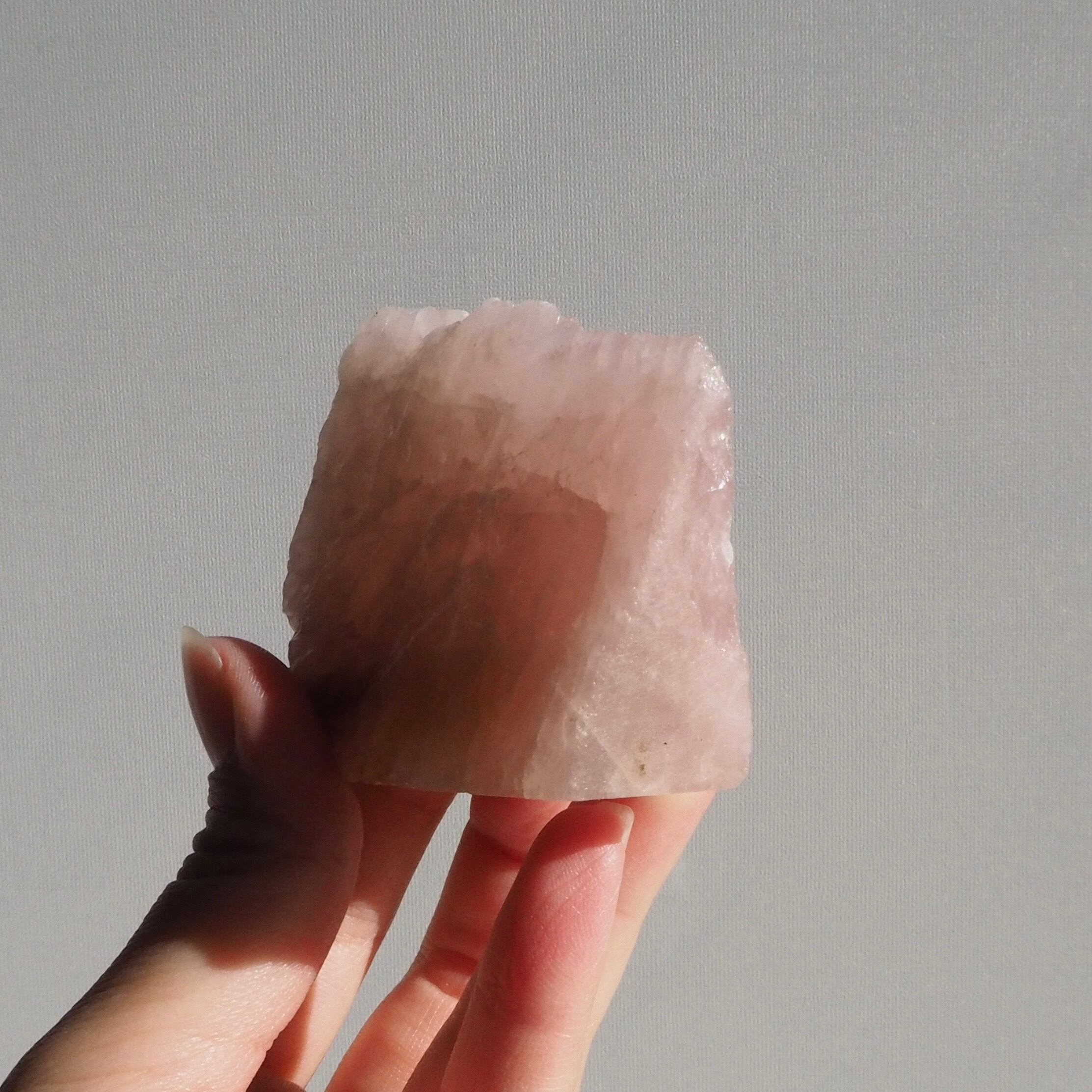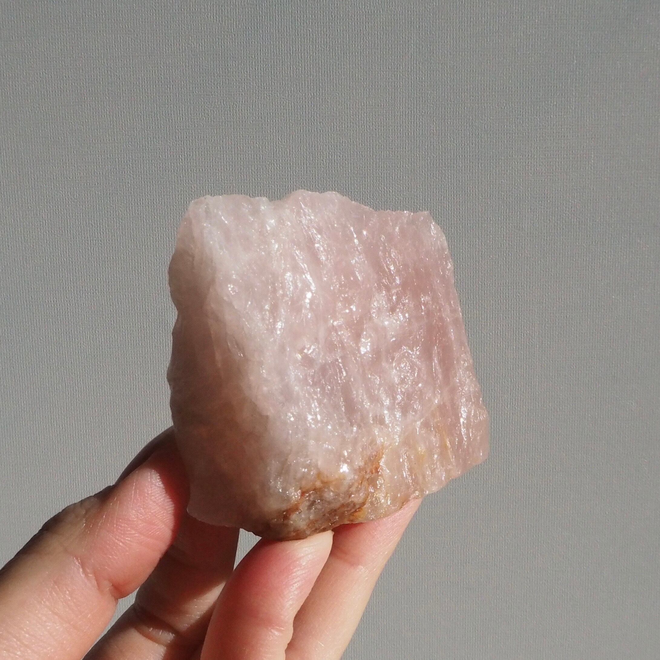 ローズクォーツの原石らしい荒々しさと、磨き面のうるうるとした透明感の両方が楽しめる、贅沢な一点です。