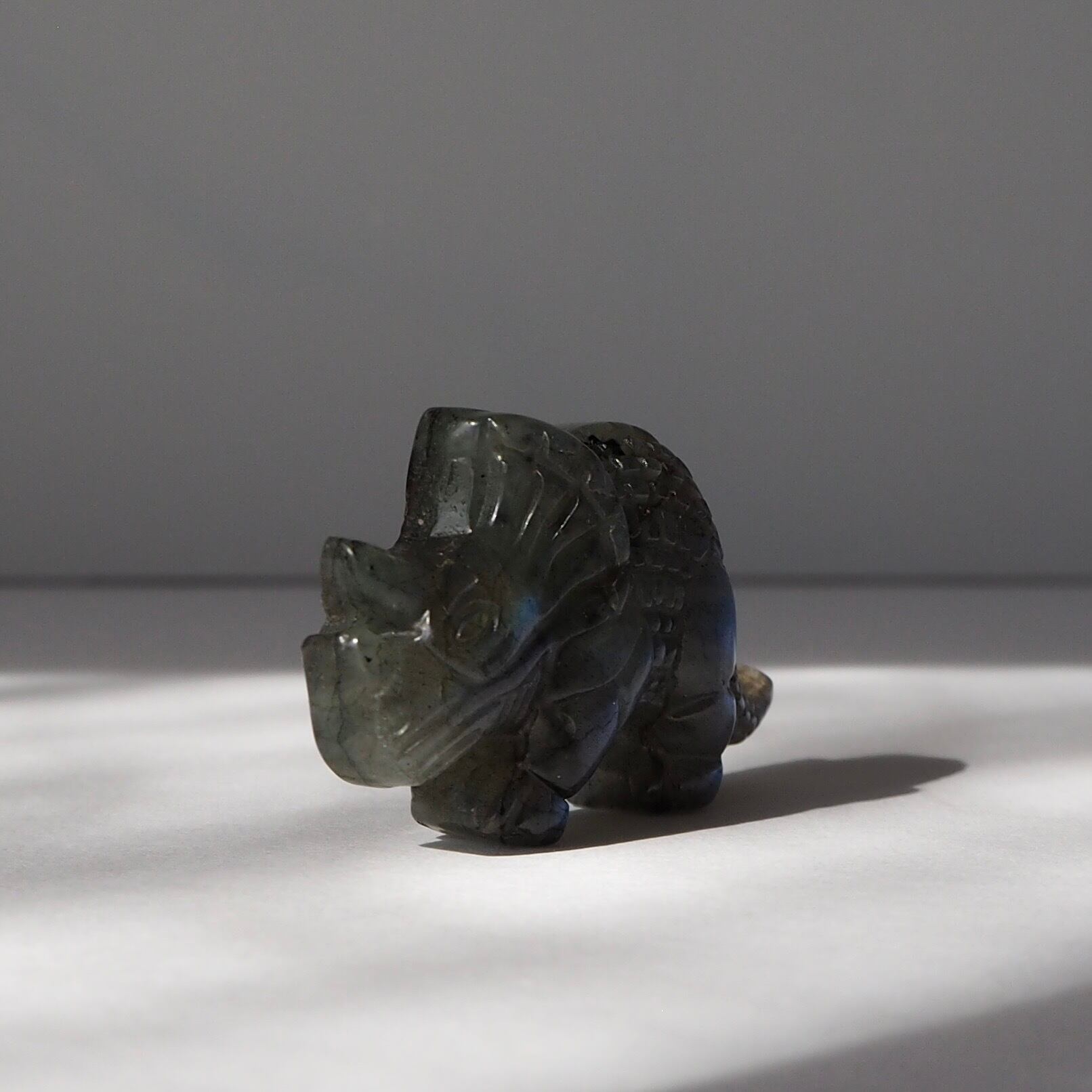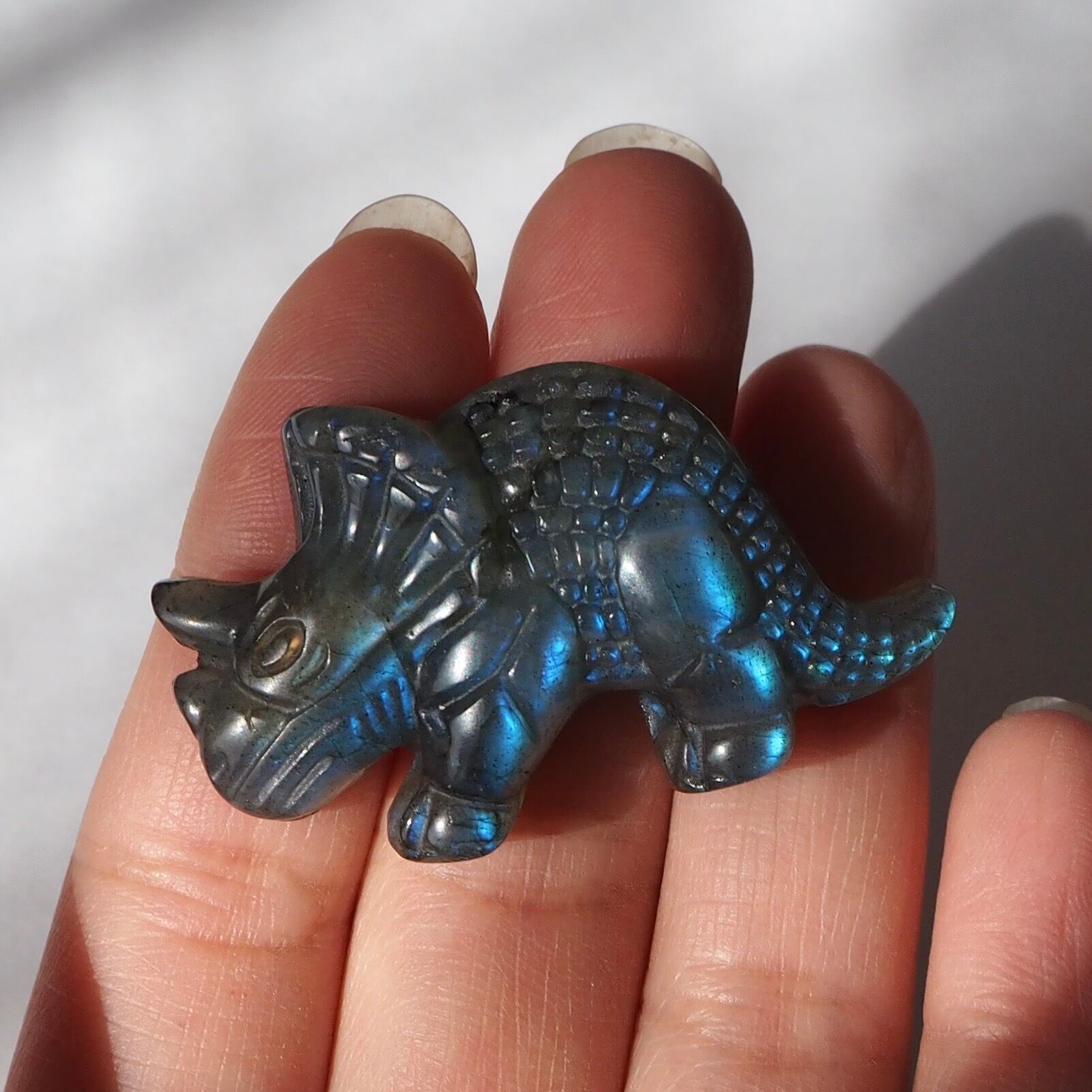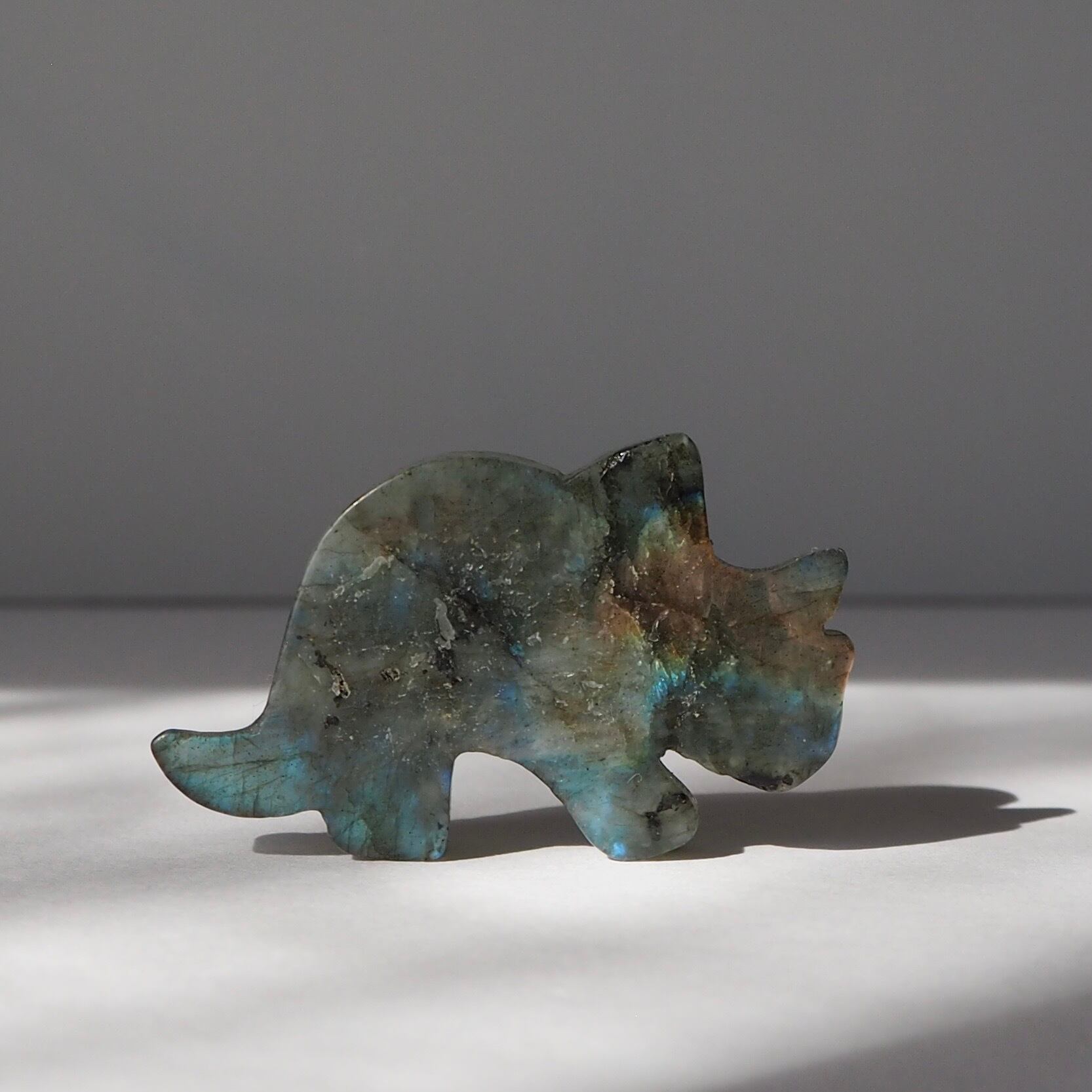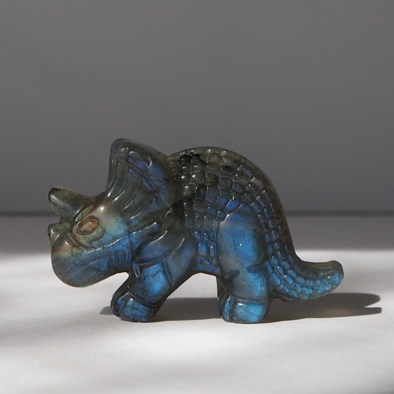 遠い宇宙の彼方からやってきたような、秘的な煌めきを宿したラブラドライトのトリケラトプスです。