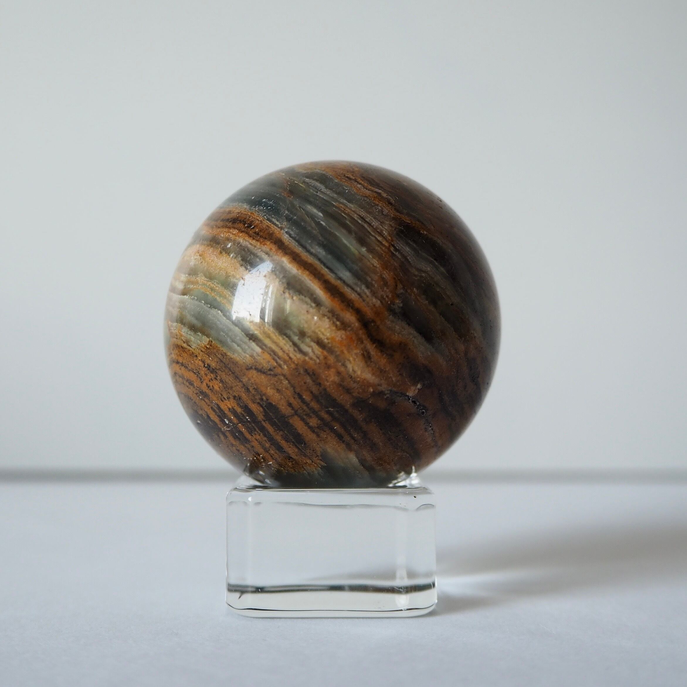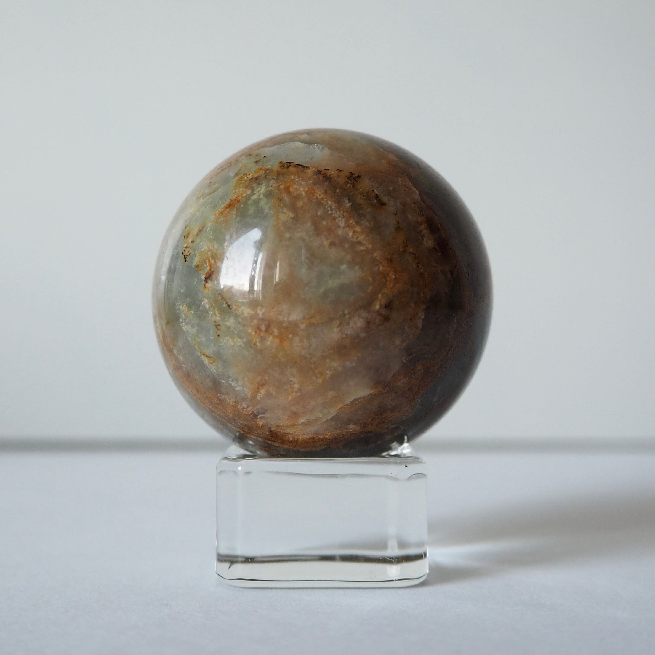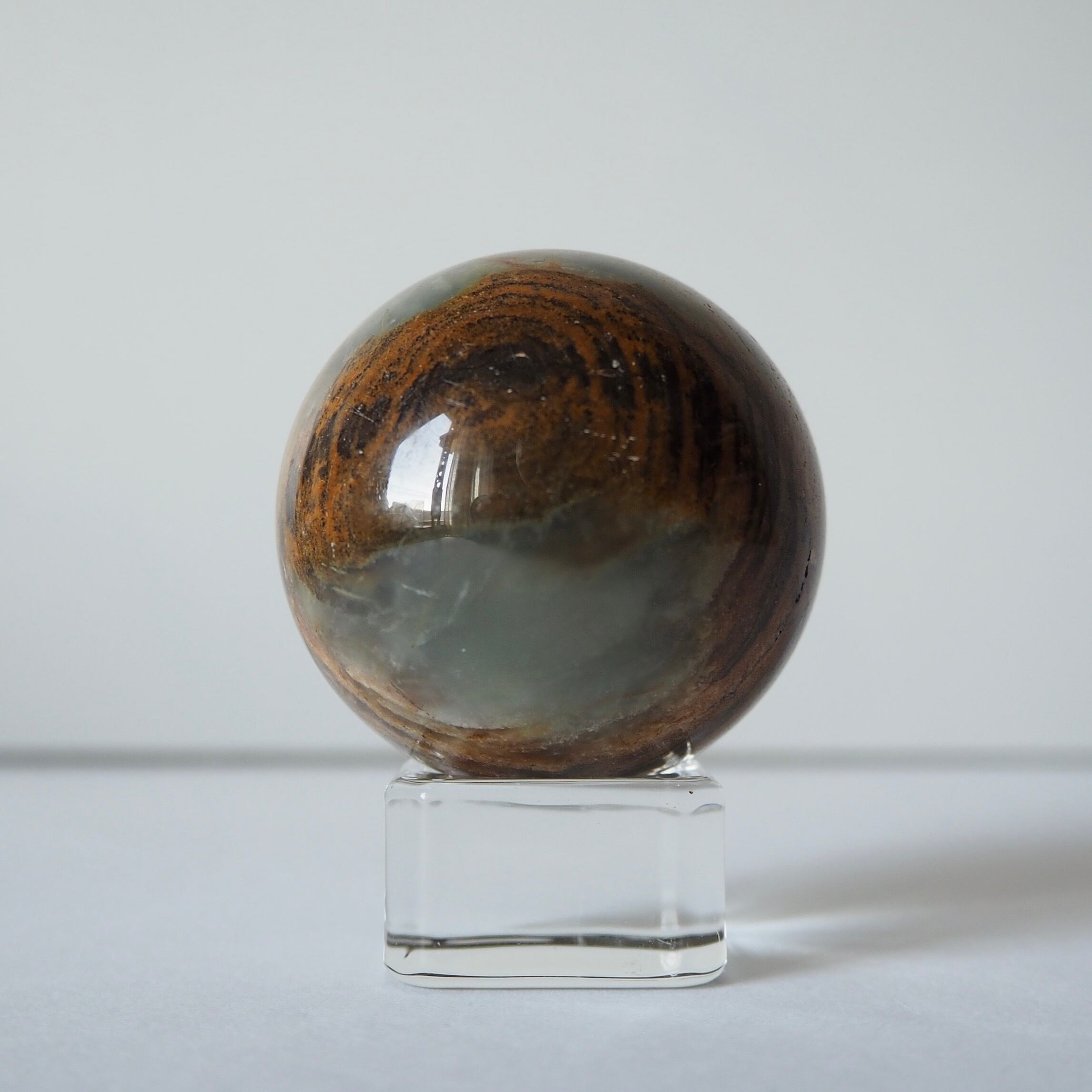 茶褐色とグレーがゆったりと流れるように縞を描く、ブルーオニキスのスフィアです。